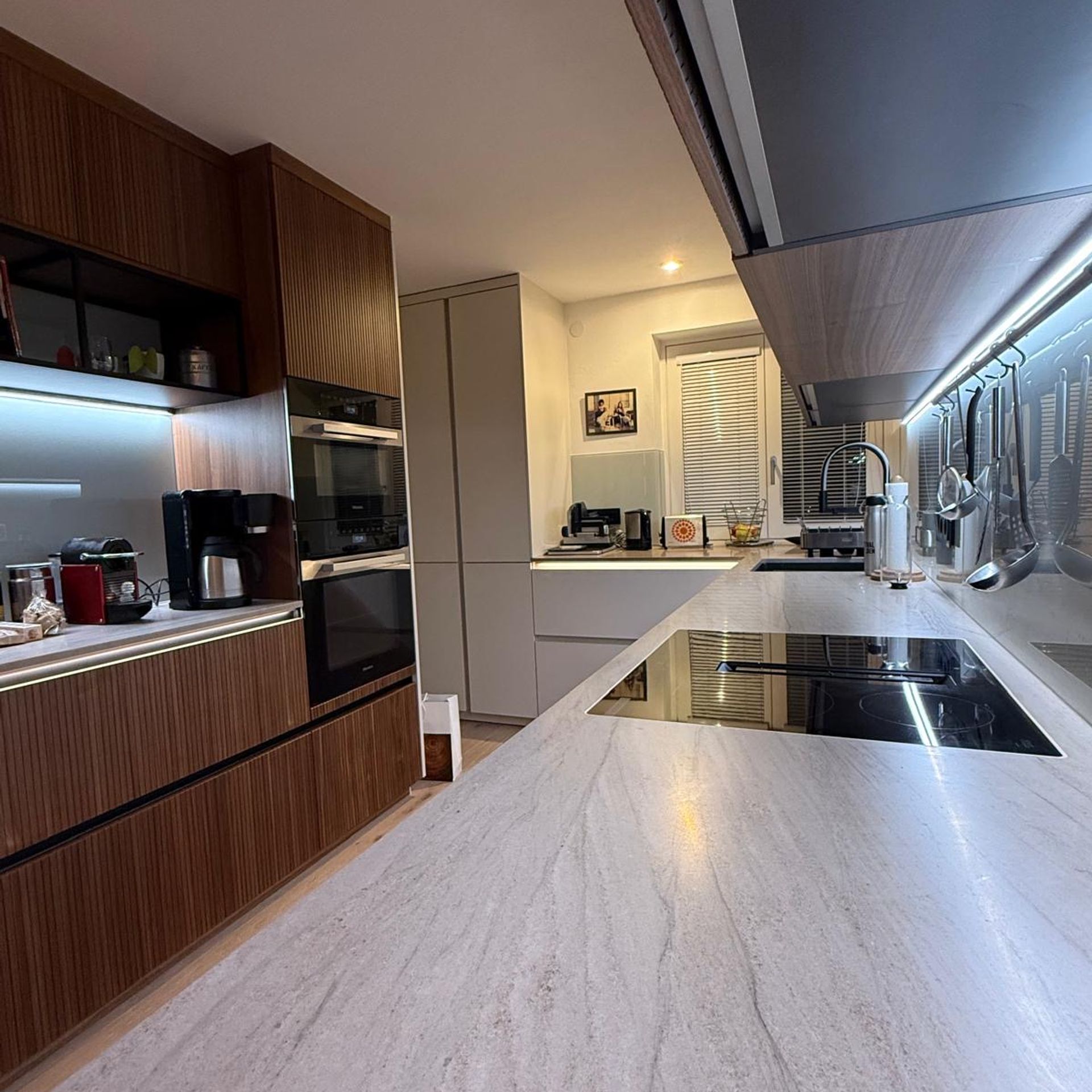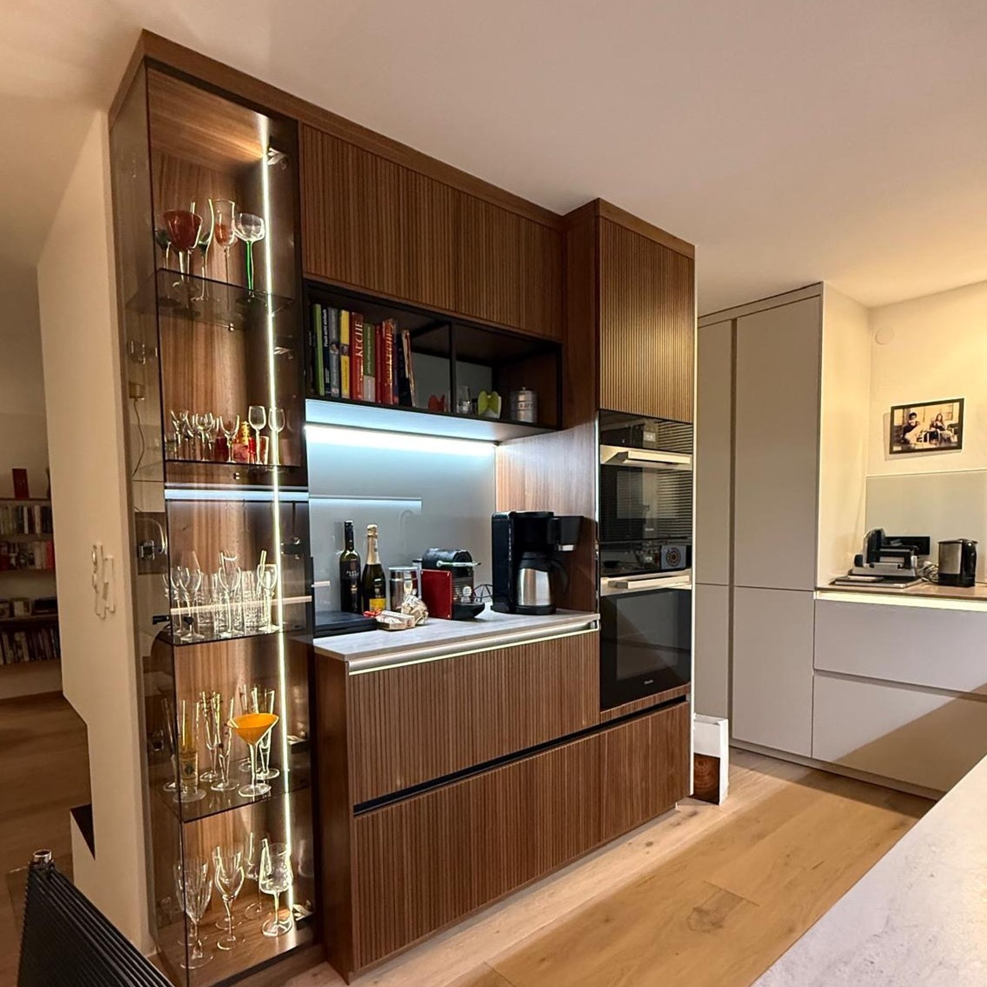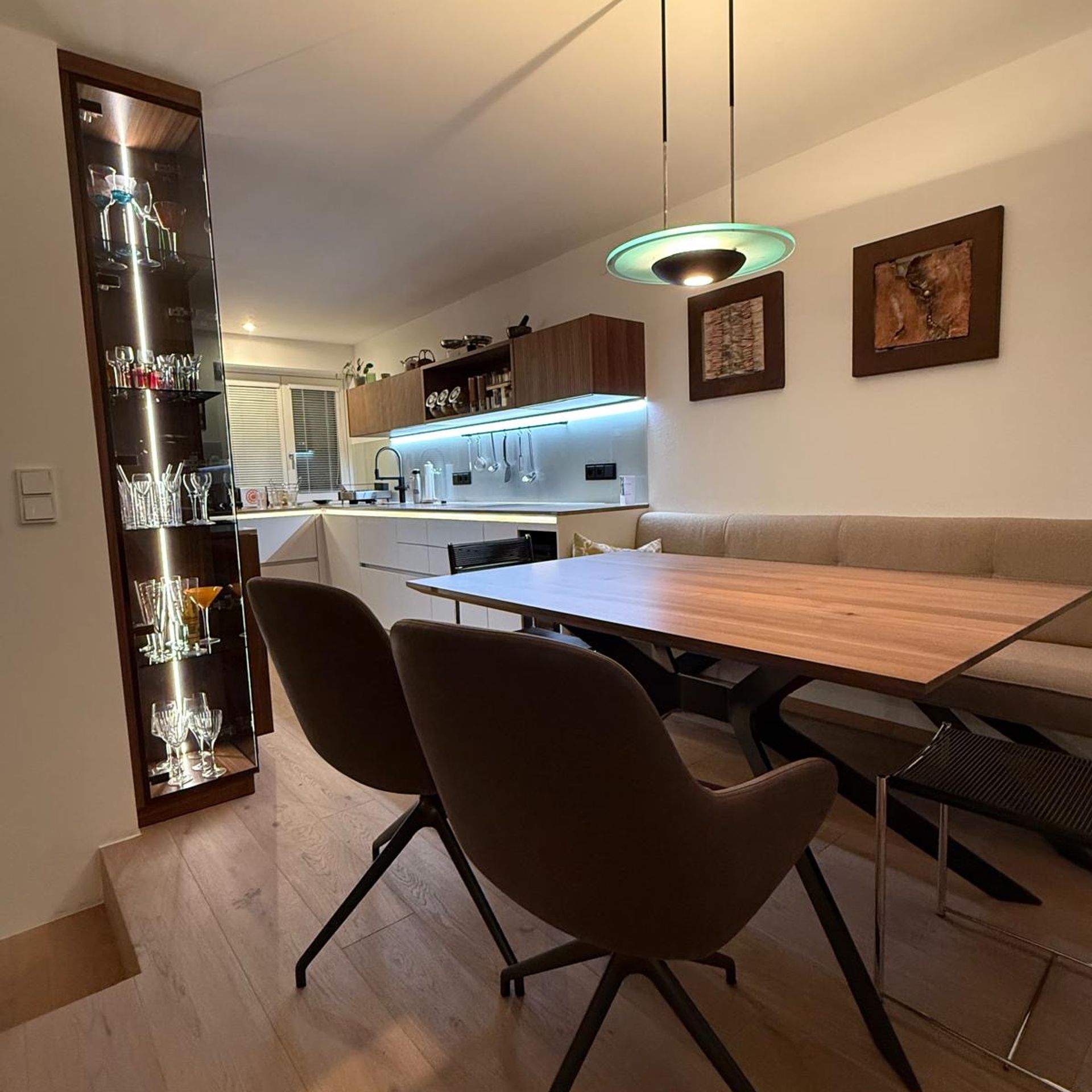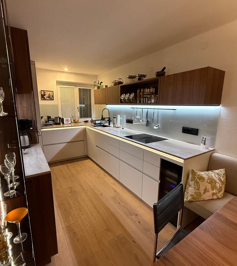Klare Formen, sanfte Strukturen, warme Stimmung Die Kombination aus Rillenfront und Stein „Serengeti Semi Gloss“ schafft einen modernen, aber wohnlichen Look.Mit dem gemütlichen Essbereich wird die Küche zum Herzstück des Zuhauses.
