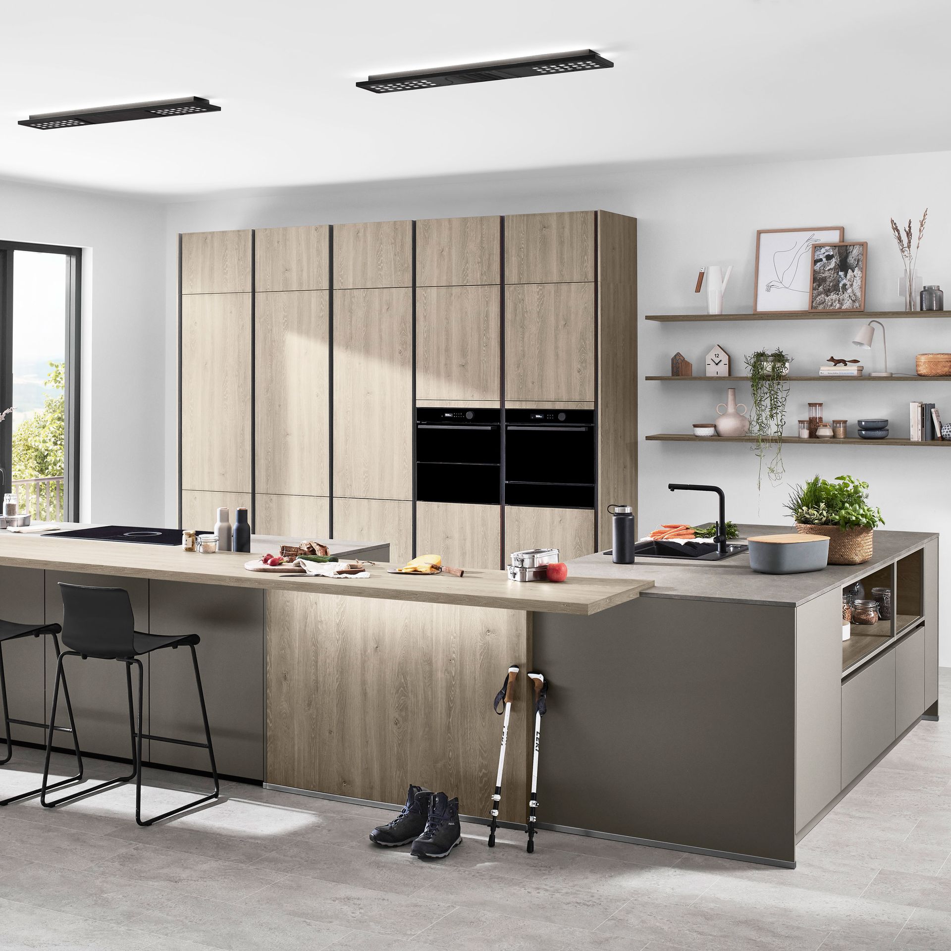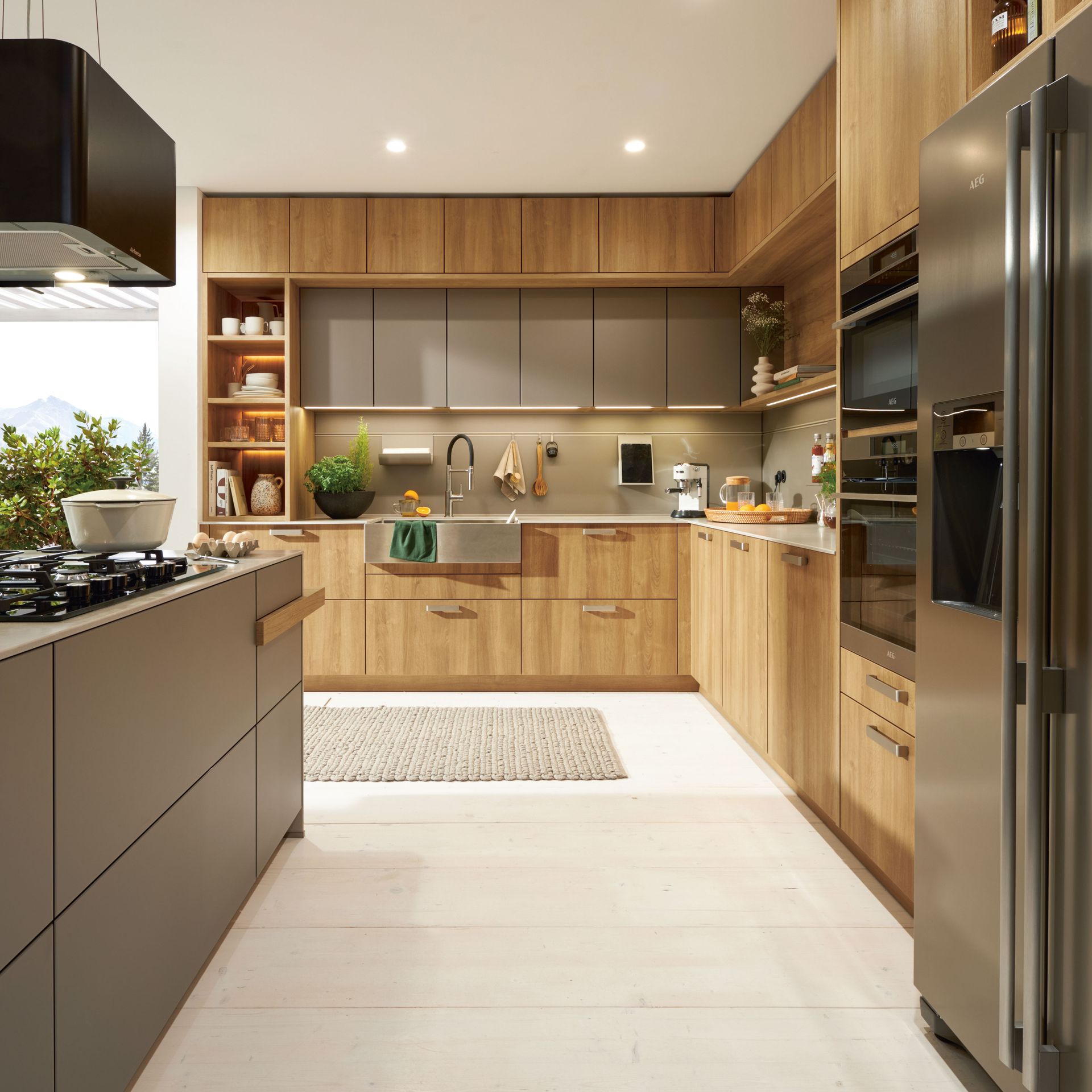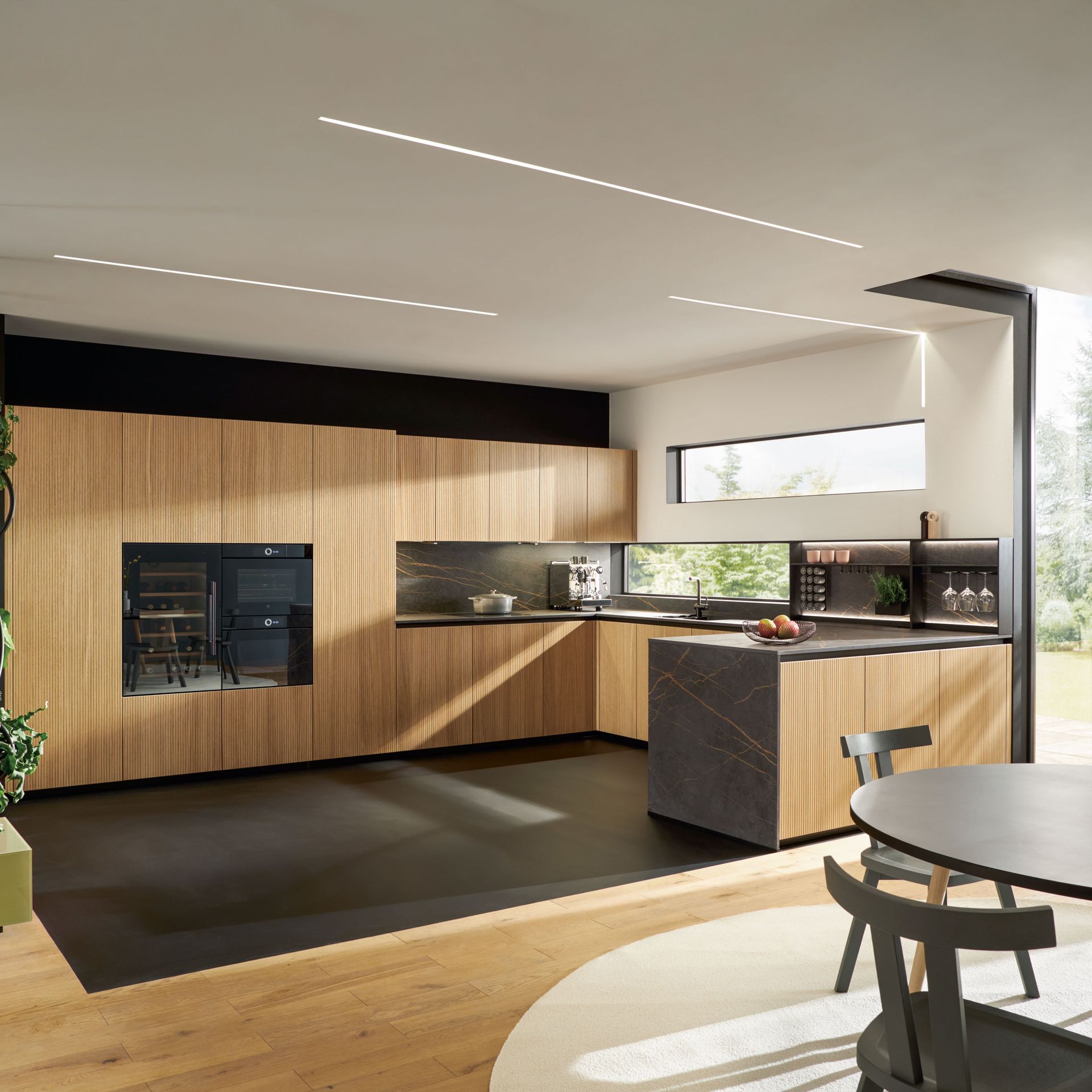Wie sieht die Küche in den 2020-er Jahren aus? Eines ist klar: Sie ist offen für Neues. Offenes Wohnen ist so aktuell wie nie zuvor, und die einzelnen Lebensbereiche verschwimmen. In der Küche wird gearbeitet, gustiert und gekostet, auch gegessen, gechillt und verweilt. Das nicht mehr so wie vor einigen Jahren meist in klinischem Weiß, sondern in eher dunkleren Tönen. Dabei reicht der Bogen von Anthrazit über Mitternachtsblau und Tannengrün bis zu dunklen Hölzern, in die sich immer wieder ein neuer, leichter Rosé Ton mischt und für frischen Wind sorgt. Diese Farbwelt ist oft matt, in Anti-Fingerprint Optik, meist grifflos und mit vielen praktischen Details gespickt. Es gibt unzählige Varianten, um typische Küchenhelfer verschwinden zu lassen, die dann mit einem Handgriff sofort parat sind. Die Zeiten, in denen die Küche offensichtlich mit ihren technischen Hilfsmitteln geprahlt hat, sind Schnee von gestern. Alle Linien sind klar und puristisch. Die Küche beeindruckt als stylishes Designmöbel und Blickfang zugleich.